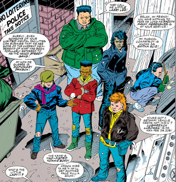 Ну так вот, прибывает Бен Гримм на улицу Янси – и сталкивается с Бандой Янси-Стрит, чья традиция – всячески изводить каменного увальня. Прежние участники банды уже давно выросли, обзавелись семьями и забросили это гиблое дело – но выросло новое поколение! Подростки всячески пытаются вывести Существо из себя – но прекращают, узнав, что он разыскивает одного пацана, Джимми. Подростки были свидетелями похищения Джимми, они выкладывают Бену всю информацию – и увязываются за ним, не слушая возражения Существа. И путь ведёт Существо и банду Янси-Стрит на один из складов, где против каменного увальня и подростков выходит, внезапно, Доктор Дум. Дум признаётся, что именно он похищает торчков. Он проводит над ними эксперименты, пытаясь найти способ сделать наркотики безвредными для организма (устранить эффект привыкания и ломку, что также сделает наркотики значительно менее прибыльными). Пока что эксперименты приводили только к смерти подопытных – но цель же оправдывает средства! Услышав достаточно, Бен идёт в наступление – даже с одной рабочей рукой он всё ещё Существо, да и банда Янси-Стрит всячески отвлекает Дума. Результат более-менее неплох – Доктор Дум сваливает, склад взрывается, но Бен успевает выбраться сам, вывести подростков и вынести Джимми, который там был прикован к операционному столу. Победа! Правда, напоследок подростки украли у Бена кошелёк…