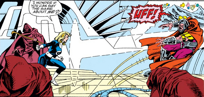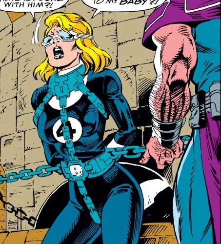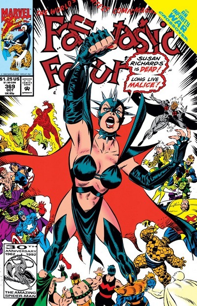 И за этим можно заглянуть в комикс Fantastic Four #369. Оказавшись в параллельном мире после выхода из портала, герои тут же становятся невольными участниками сражения между Дозором Бесконечности и Таносом, которого все подозревают в сотрудничестве с Магусом, не догадываясь о том, что безумный титан тоже был клонирован. Словно и без того эпика мало, внезапно объявляется Галактус (настоящий), а на борту его корабля – Нова, Серебряный Сёрфер и Доктор Стрэндж. И всех драчующихся, включая Таноса, переносят на борт – мол, разговор есть. А Магус пользуется моментом – раз практически все герои Земли сейчас очень и очень заняты, Землю как раз можно подмять под себя! Нажимается одна кнопочка – и абсолютно всё население Земли впадает в стазис. Ну, почти всё. Один гость планеты остаётся подвижным – Эйрон, Наблюдатель-ренегат. А на борту корабля Галактуса неожиданная перемена накрывает Сью Ричардс. В сознании Невидимой Женщины просыпается давно подавленная личность, Злоба (Malice), и пытается убить Сью. Невидимая Женщина оказывается сильнее, и побеждает, пусть и не без труда – но решает не подавлять Злобу, как в прошлый раз, а слиться с ней. Да, это опасно – есть шанс, что со временем Злоба возьмёт верх. Но пока что это даёт Сью изрядный прилив сил и прокачку способностей.