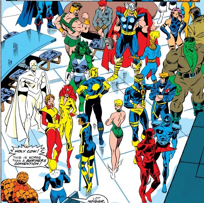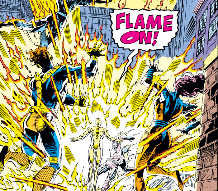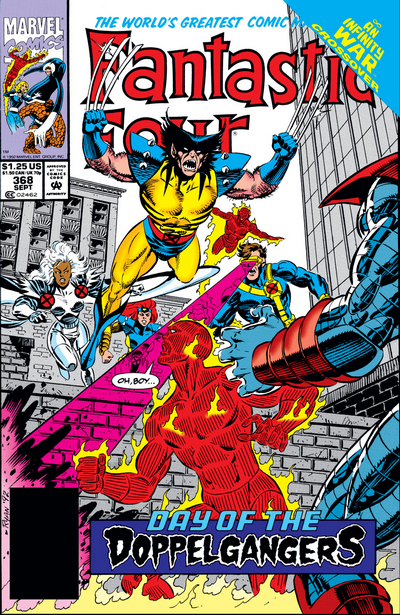 Или нет? Читаем комикс Fantastic Four #368, чтобы узнать! Плохие новости – верхние этажи Фор Фридомс Плаза были уничтожены. Хорошие новости – герои не погибли. Невидимая Женщина сдержала силу взрыва своим силовым полем, а Тор вывел энергию вверх с помощью молота. Собравшиеся герои обезвреживают двойников Мистера Фантастика и Железного Человека – но объявляется сам Магус с двойником Таноса и забирает своих «пешек». Командование Фантастической Четвёркой на себя берёт Сью, а Джонни Шторм улетает, чтобы проветриться, и подумывает, не покинуть ли команду, а то напрягов очень много. Ну типа, Рид Ричардс неосторожные эксперименты ставит, в результате которых был весь замут с Оккулюсом, теперь вот эта шняга с двойниками…толком подумать Факелу не дают, потому что на него нападает команда двойников Людей-Икс в полном составе – Циклоп, Колосс, Гроза, Джин Грей и Росомаха, а с ними двойник Человека-Факела. Против такой толпы даже живому огнемёту будет сложно, так что Джонни решает отступить и продумать план дальнейших действий.
