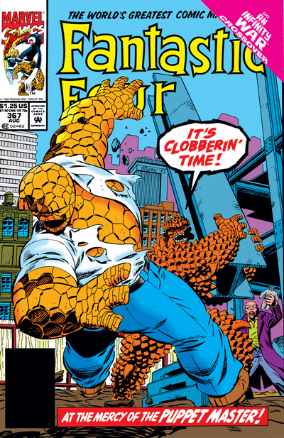 Но поскольку это не комиксы про Людей-Икс, в которых Марвел борзеет по полной, можно читать дальше по тайтлу, сильно клочковатым сюжет не станет. А потому можно перейти к комиксу Fantastic Four #367 за август 1992 года. Лже-Рид обзванивает героев и просит их встретиться с ним в Фор Фридомс Плаза, якобы вселенной грозит гаплык эпического уровня – а Невидимая Женщина понимает, что что-то с Мистером Фантастикой не так. Проверив запасную систему безопасности, считывающую мозговые волны, Сью убеждается в том, что этот Рид – не тот, за кого себя выдаёт. А тем временем Бен Гримм отвлекается от встречи с Шерон Вентурой, когда видит Кукловода – своего старого врага и отчима Алисии Мастерс. Кукловод всячески ругает Бена за то, что тот променял милашку Алисию на Шерон – но разговор не задаётся, ибо ВНЕЗАПНО объявляется злой двойник Существа и нападает. Двойник застаёт Бена врасплох и всячески его провоцирует – и двойнику удаётся вывести Бена из себя, в результате чего Бена оказывается легко ушатать. Двойник заматывает Бена в лестницу от пожарного выхода из соседнего здания и наносит сокрушительный удар.