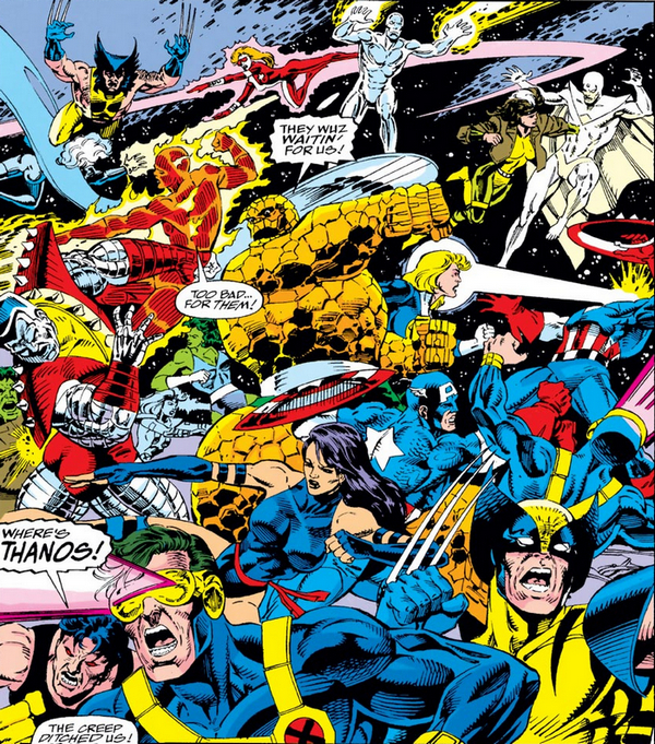 Война Бесконечности продолжается, а сегодняшняя часть поста заканчивается, в комиксе Fantastic Four #370 за ноябрь 1992 года, от Тома ДеФалько и Пола Райана. Вовсю идёт сражение героев с двойниками, и в этом сражении Бен Гримм переживает за Человека-Факела. Факел не стесняется убивать двойников, сжигая их дотла своими огненными способностями. «Эй, Спичка! А ты не офигел часом Карателем прикидываться? – Бен, да они даже не люди! Ну, и не мутанты! Это какие-то склизкие твари с тентаклями! – И чо теперь, убивать их? Неправильно это, Джонни! – Лучше я их, чем они меня! – Джонни, герои не убивают! – Бен, отвали, а? Да, я тоже обычно не убиваю, но толку мне от моих принципов, если меня десять Росомах на клочки разорвут?». А пока сражение кипит, Невидимая Женщина пробирается на базу Магуса и видит, что там тоже шумно – Танос сражается со своим двойником. Кому бы помочь? Сью помогает вырубить одного из Таносов и надеется, что сделала правильный выбор. И она оказывается права!