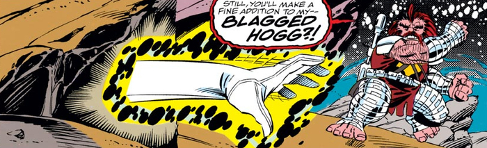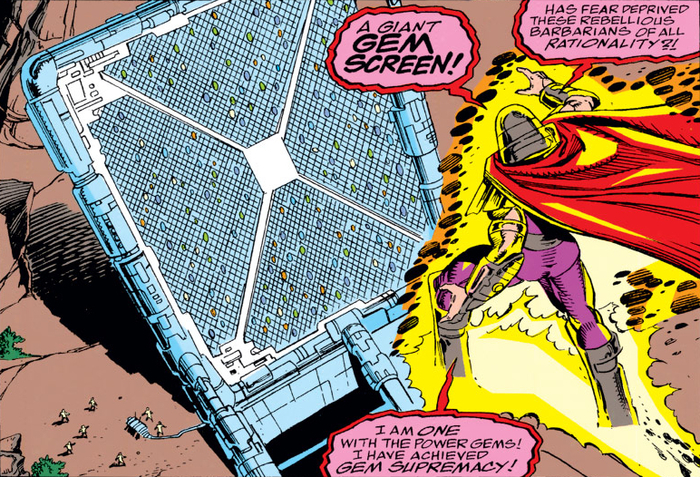 А Дикокровец рассказывает краткую историю этого мира. В общем, было два стула, то есть, две высокоразвитых планеты. И случилась между ними война, в ходе которой одна планета была уничтожена, её остатки стали самоцветами и окружили вторую планету, которая скатилась в тёмные века. И начали на этой планете рождаться «одарённые», умеющие управлять энергией самоцветов. Самыми одарёнными из Одарённых были близнецы – Оккулюс и Дикокровец. Но Дикокровца прогнали из цивилизованного мира ссаными тряпками, а Оккулюс потянулся к абсолютной власти. Ну и вот что имеем. Изучив один из похищенных повстанцами самоцветов, Рид разрабатывает план – и вскоре вместе с Беном и Дикокровцем тайком проникает в подземелья под замком Оккулюса и освобождает Сью. Затем Мистер Фантастик и Невидимая Женщина идут спасать Франклина, а Существо и Дикокровец нападают на Оккулюса. Отстегнув Франклина от машины, Рид использует созданное им на коленке оружие, вытягивающее энергию камней из Оккулюса – но тиран уничтожает оружие, восстанавливает свою энергию и злорадно сообщает – «Я добился абсолютной силы! Падите на колени и поклянитесь мне в верности, иначе я вас всех на ноль помножу!». Так себе перспектива…