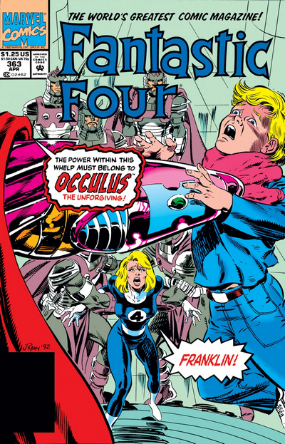 Все на нервах, и всё это вытекает в комикс Fantastic Four #364 за май 1992 года с заголовком «Оккулюс всемогущий». Итак – машина работает, и через Франклина перекачивает силу самоцветов в тело Оккулюса. Чувствуя, как его сила растёт, тиран покидает замок, не слушая мольбы жены о том, что никому нельзя владеть абсолютной силой. Оккулюс намерен в первую очередь наконец-то расправиться с давно досаждающими ему повстанцами. Теми самыми, предводителем которых является Дикокровец. Против Оккулюса выходят Человек-Факел и Существо – но в итоге им, Риду, Дикокровцу и повстанцам приходится скрываться от тирана в тоннелях, и Оккулюс обрушивает за ними вход в тоннель. По счастью, тоннели эти ведут как раз на базу повстанцев. Поняв, что у них теперь общий враг, Дикокровец предлагает полное содействие своей банды – оружие из арсенала, информация, что угодно. А Сью опять приходит в себя в темнице, и её навещает Ланда, жена Оккулюса. Невидимая Женщина требует, чтобы ей сказали, что с её сыном. «Не переживай, мальчик жив. – Ну так отпустите его! Или пустите меня к нему! – Извини, не могу. – Ты что, не видишь, что твой муж поехавший?! – Ну так-то да, но он всё ещё мой муж, не могу я вот так просто взять и предать его». Тяжёлый случай…