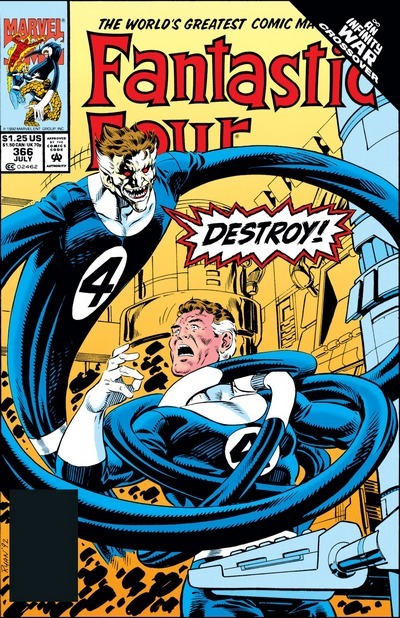 А теперь – комикс Fantastic Four #366. Ни минуты покоя, вечно какие-то новые проблемы назревают. Конкретно этот комикс – часть сюжетки «Война Бесконечности», пустившей корни в кучу тайтлов. Злодей Магус создаёт двойников героев, стремясь заменить весь (или почти весь) геройский контингент своими пешками. Злые двойники уже нападали на Человека-Паука, Железного Человека и Росомаху…но сейчас не до них. Рид Ричардс возится в лаборатории, тщательно отмахиваясь от пристающего к нему Джонни Шторма. Человек-Факел ставит под сомнение лидерские качества Мистера Фантастики, и настаивает, что Рид слишком безрассуден в своих экспериментах. Именно из-за одного из экспериментов Рида появилась Фантастическая Четвёрка. Именно из-за них Франклин родился с опасными для себя и остальных мутантскими силами. Именно из-за них вторая беременность Невидимой Женщины закончилась выкидышем. Именно из-за экспериментов Рида Сью и Франклин были похищены в Инниверс. Но Рид отмахивается, мол, не твоего ума дело, не лезь и оставь эти вопросы кому-нибудь умному. В душе понимает, что Джонни прав – но признать не может.