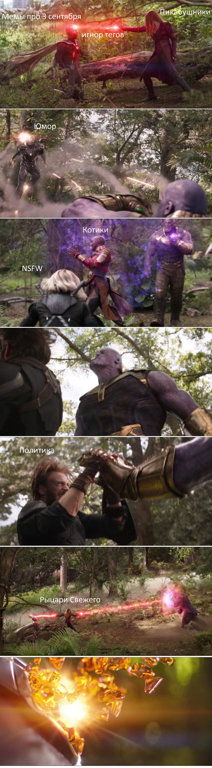 Вторая половина, раскритиковала Таноса, мол, хрена ли ты такой говнюк, мог бы создать ресурсы создать и всё было бы четко.