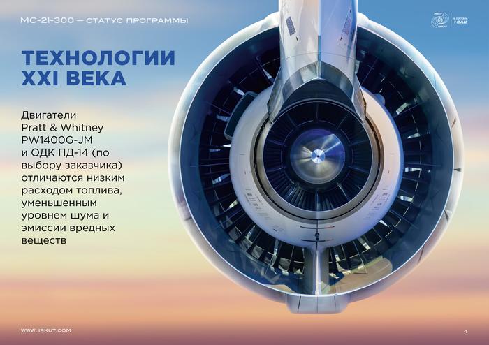Самолет МС-21, что означает «Магистральный самолет XXI века». Отличается повышенным комфортом для пассажиров. Он имеет самый широкий фюзеляж в классе среднемагистральных самолетов (4,06 м). Проход между креслами в зависимости от их типа составляет от 50,55 см до 57,15 см. Кроме того, здесь предусмотрены большие иллюминаторы, которые увеличили естественную освещенность салона. Улучшен микроклимат в самолете: давление приближено к естественному, установлены система увлажнения воздуха и новейшие биологические фильтры, есть три зоны регулирования температуры.