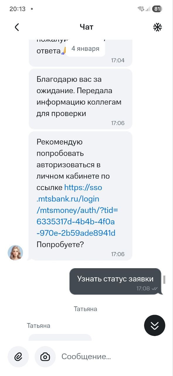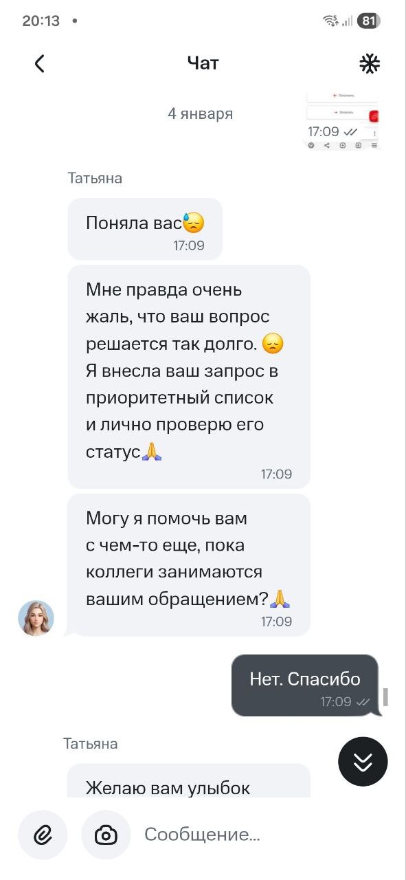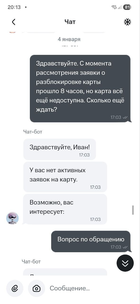 - 4 января: получаю ответ о том, что заявка решена. Проверяю — карта всё так же заблокирована. Предполагаю, что банк просто закрыл обращение для статистики, не сделав ничего. В этот же день очередное обращение, очередное ожидание и новая заявка, которая висит мертвым грузом.