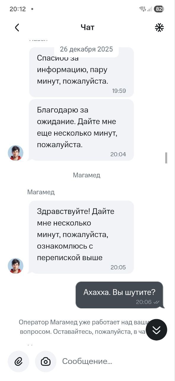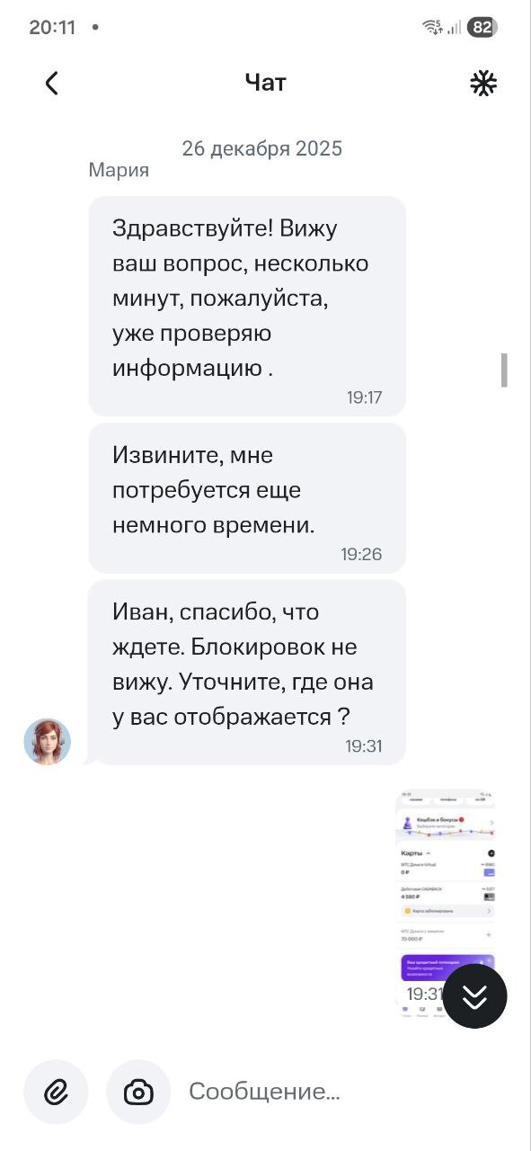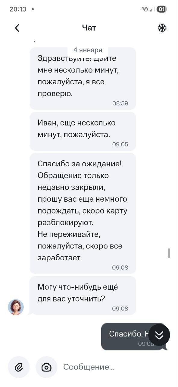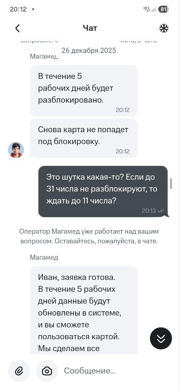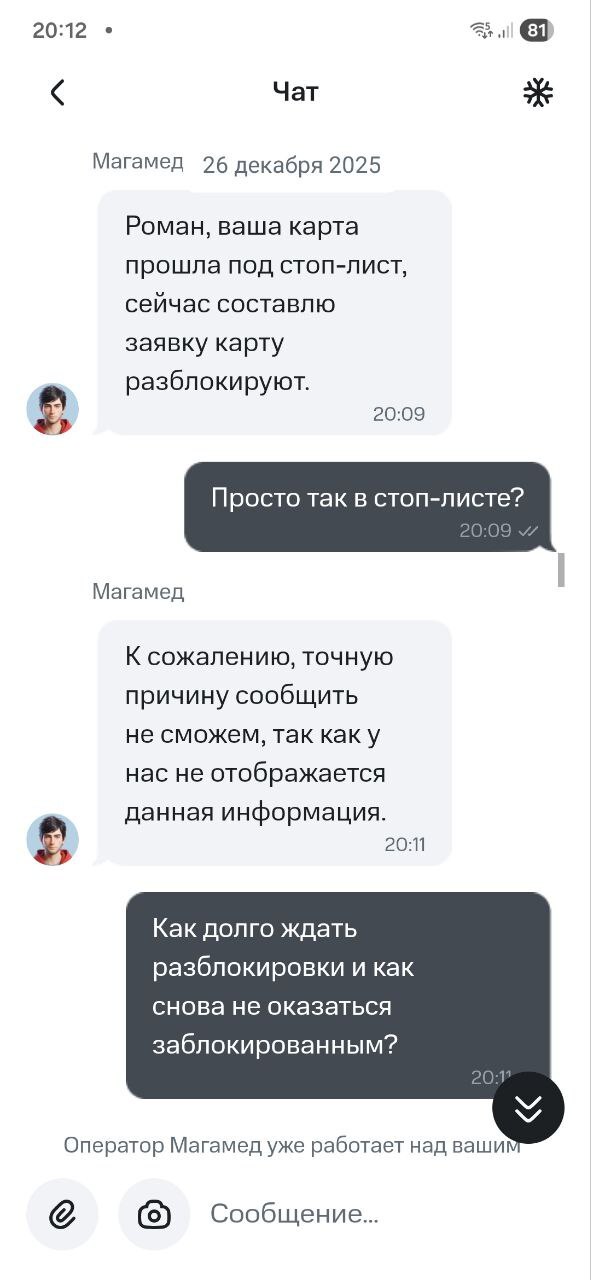 - 26 декабря: 1.5 часа в чате, 4 разных оператора. Сюрреализм ситуации в том, что поддержка вообще не видела блокировку. Пока я не мог воспользоваться своими деньгами, мне доказывали, что всё в порядке. Только один из всего списка операторов дал неясный ответ: «Ваша карта в стоп-листе». Итогом стал формальный тикет «на разбор».