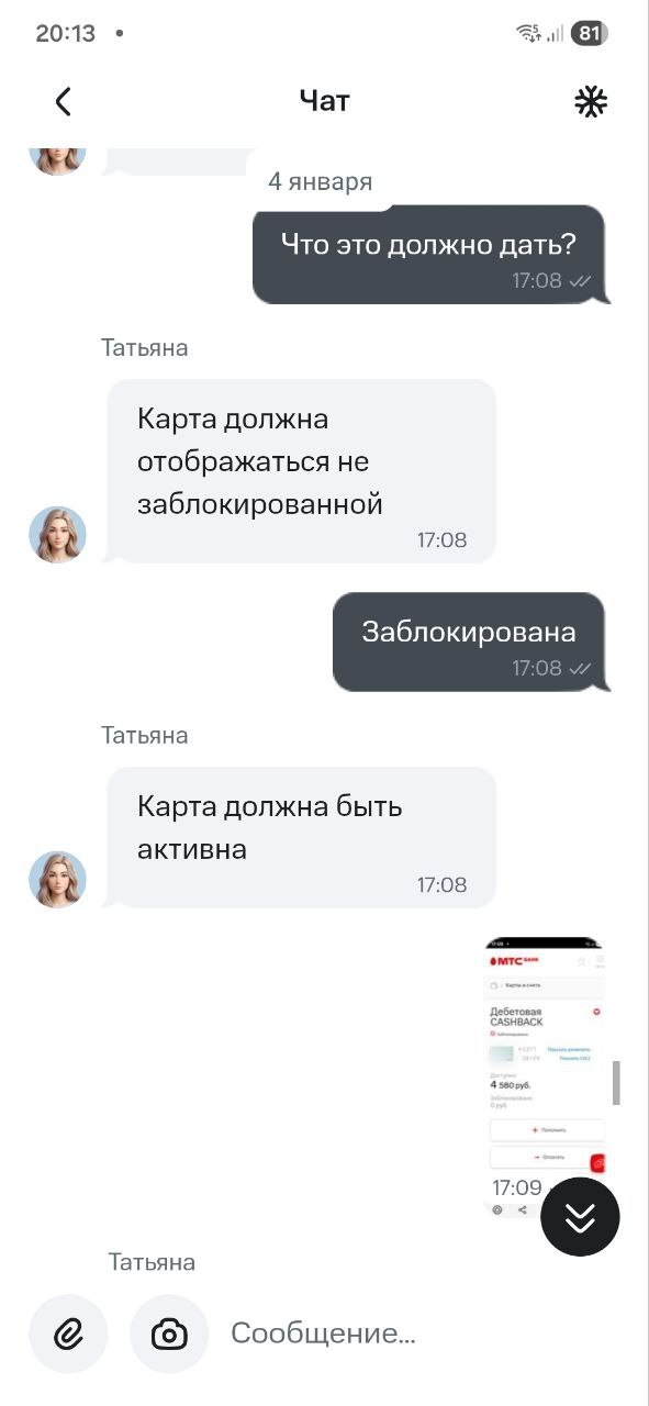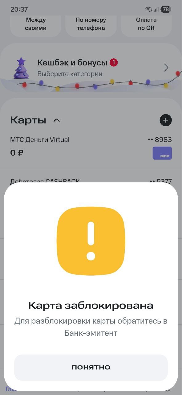 26 декабря 2025 года перевел собственные деньги со своего же счета в другом банке на карту МТС Банка. Итог: моментальная блокировка карты без уведомлений и объяснения причин.