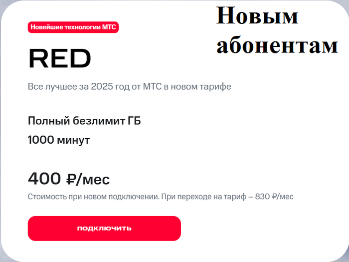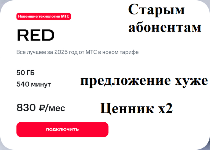 Под Новый Год МТС решил, что у него маловато абонентов и ввел тариф «МТС RED». Ну ввел и как бы хрен и с ним, он для новых клиентов вроде как хороший - по цене 400 руб, но вот старые клиенты поглядывая на это в очередной раз поняли, что новых то завлекают - а старые - "Да вы уже и так клиенты, нахрен вам чето предлагать". И получилось что для новых тариф за 400, а ты старик если хочешь поменять свой тариф, давай как нам х2 цену и условия мы тебе лошаре хуже сделаем!
