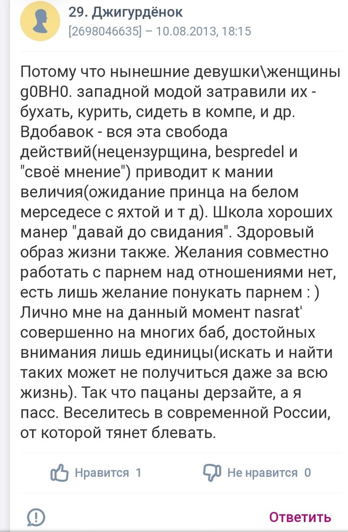 Я выложу посты девушек/женщин с этого форума, а выводы сами делайте.