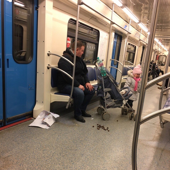 Московское метро. Эти конфеты рассыпаны уже минут 10. Ребёнок их ест: