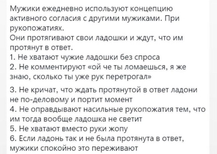 То же самое касается рукопожатий. Ладно когда два-три человека встретились, пожали друг другу руки и что там дальше у них по сценарию. Но ведь иногда до маразма доходит. Вот, например, собрание монтажников крупного предприятия. Человек 35-40. Все разбились на могучие кучки, что то обсуждают, мигрируют из одной кучки в другую, ждут начальство с "невероятно важными объявлениями". И тут залетает припозднившийся бедолага. И что? Правильно. Зашитые в подкорку правила поведения не позволяют ему сказать "всем здрасьте" и присоединиться к одной из компаний. Нет. Он вздыхает и решительно обходит всех с протянутой рукой. 40, мать его, рукопожатий за несколько минут. Даже если отбросить вопросы гигиеничности подобного ритуала (ведь кто знает, где несколько минут назад побывала любая из сорока пожатых ладошек), выглядит все нелепо и натянуто.