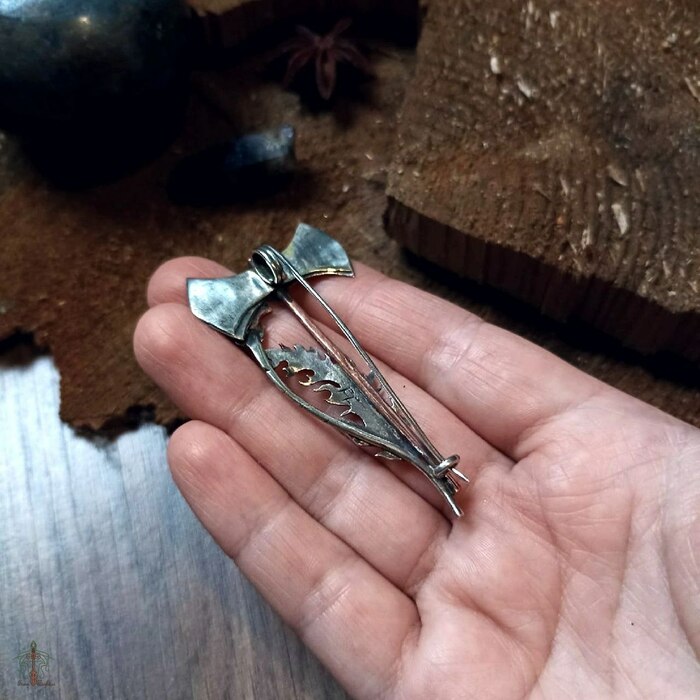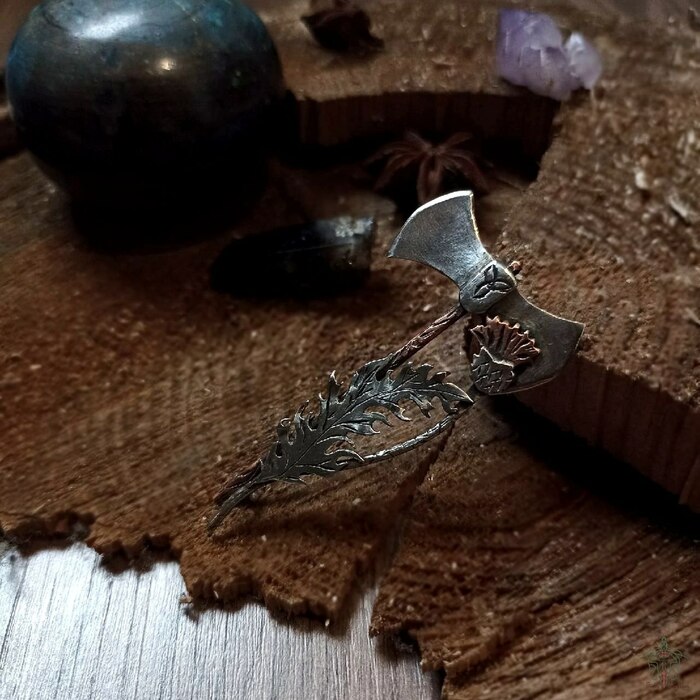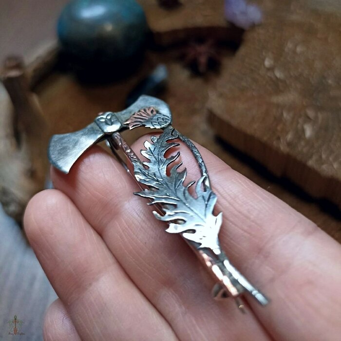 Брошь - килтпин из нейзильбера и меди. Выпиловка, гравировка, текстурирование, пайка, патина.