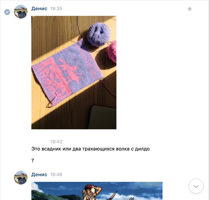 Всем Добрейшего! Дабы разбавить цветовую палитру связанных мной вещей, решил попробовать сочетание сиреневого с розовым. В качестве схемы выбрал шарф по аниме Принцесса Мононоке: