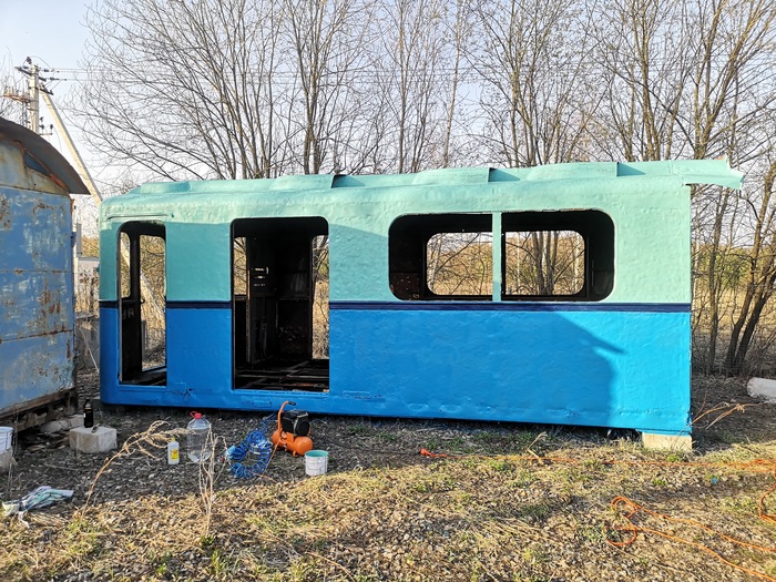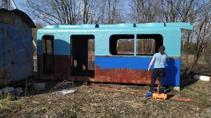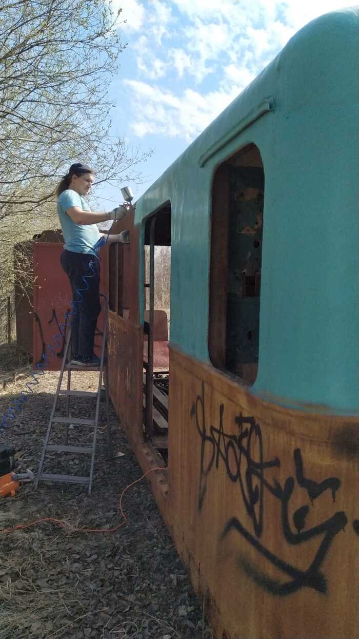 Было дано задание от организаторов - покрасить и постелить временные полы. Повторюсь это не реставрация, а подготовка к выставке. Верх красится в светло-зелёный цвет. Да прям по ржавчине, хотя это было кислотным грунтом когда-то. Всё соответствует цветам с завода-изготовителя, которыми окрашивались вагоны в тот период.