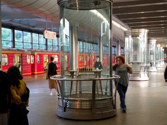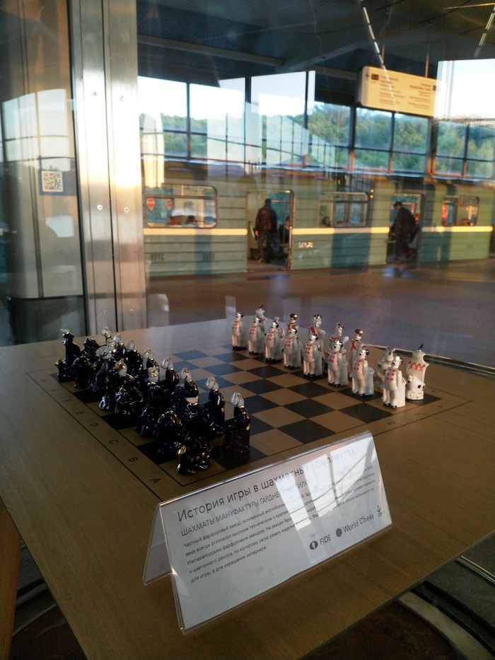 На днях оказался на станции метро "Воробьёвы горы" и имея в запасе полчаса свободного времени, стал не без удовольствия рассматривать демонстрационные ларьки с выставленными в них шахматными фигурами на досках.