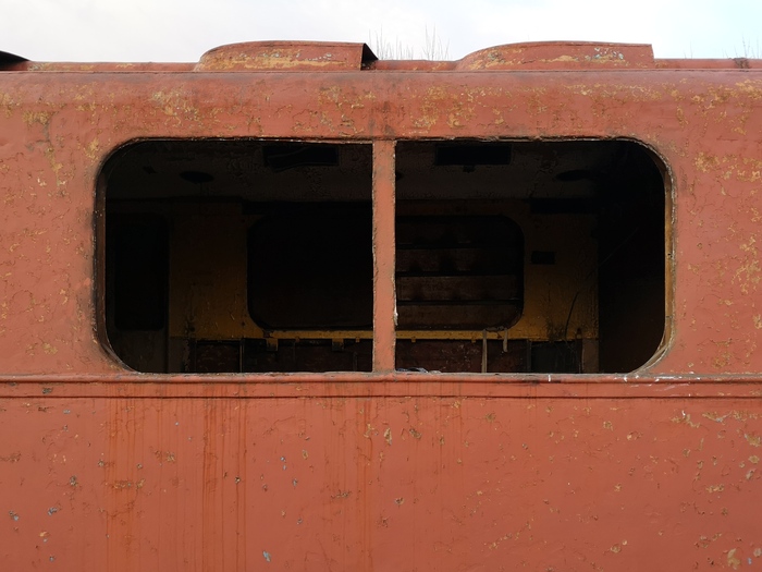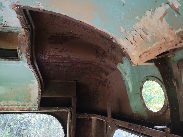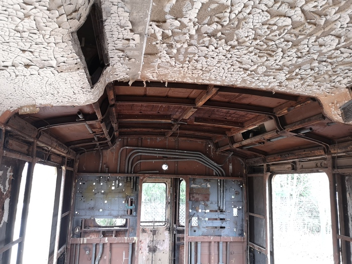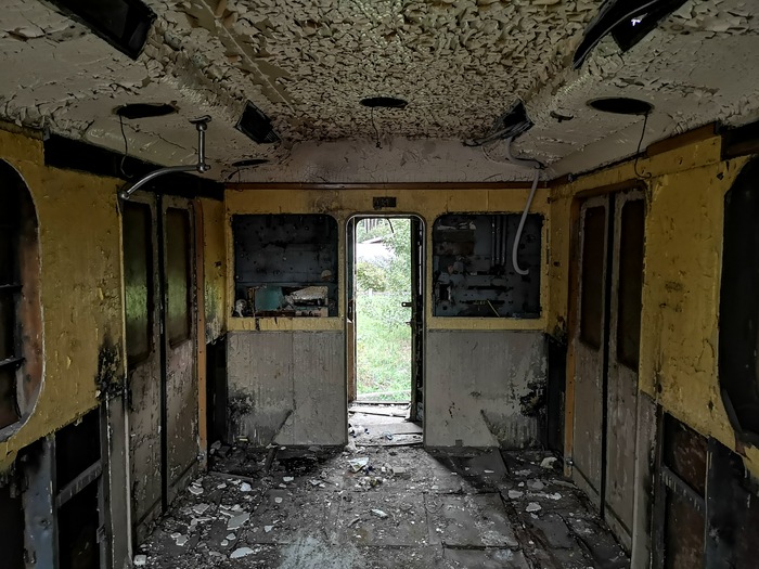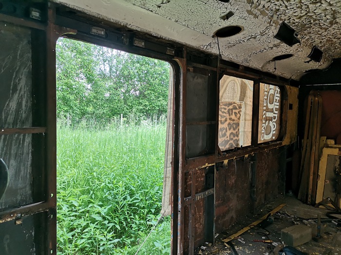 Заходим во внутрь. Салон вагона. Куски поручней присутствует, линкруст сохранён