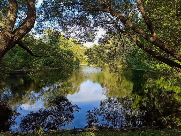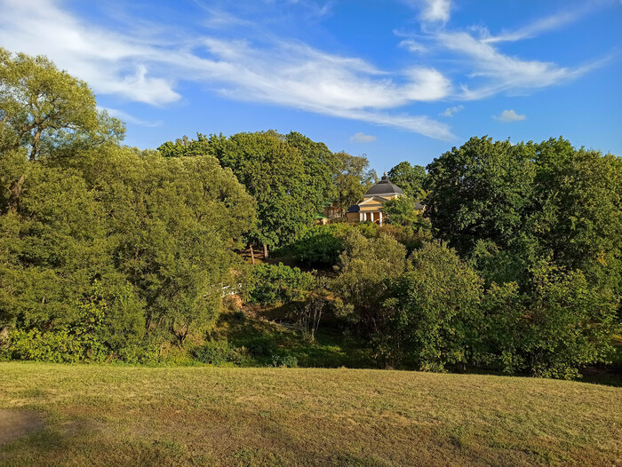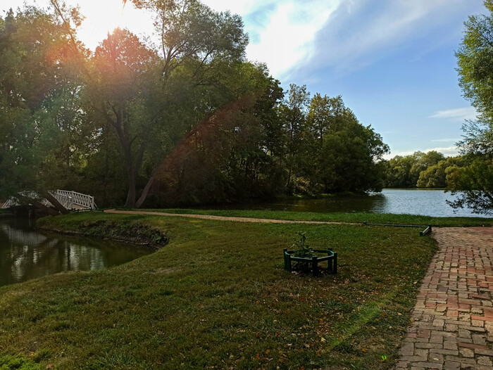 На территории усадьбы своя атмосфера: тишина, умиротворение, красота-природа, много лавочек, удобные тропинки. Куда идти не знали, поэтому после Барского пруда пошли, как говорится, куда глаза глядят.