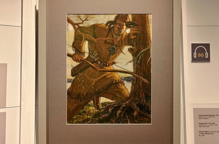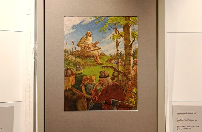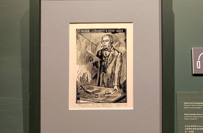 В первом зале экспозиции «От слова к книге» рассказывается о создании поэмы. Акварельный рисунок «Рунопевцы» 1950-х годов написан художником Мюдом Мечевым, когда он работал над серией иллюстраций к «Калевале». Наверное, именно с такими рунопевцами общался Лённрот, когда ездил по Финляндии и Карелии в поисках фольклорного материала. В данном контексте руны – это не буквы, а традиционные эпические песни прибалтийско-финских народов. Собственно, словом «runohus» (кар.) или «runous» (фин.) обозначается термин «поэзия».