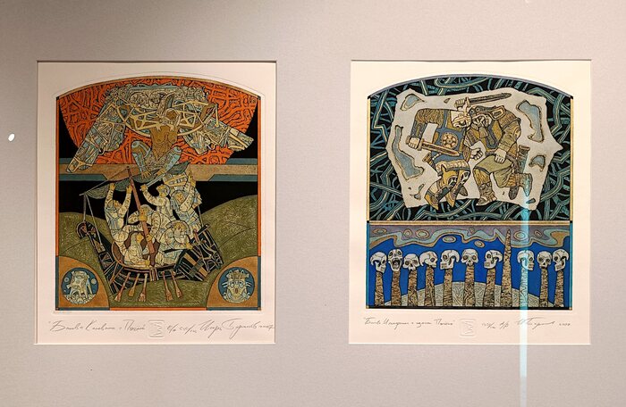Третий зал «Противостояние и слияние» рассказывает о главном сюжетном конфликте эпоса «Калевала» – противостоянии двух мифических стран Калевалы (Вяйнолы) и Похьёлы. В 2007 году выпускник Репинки (Санкт-Петербургской академии художеств) Игорь Баранов в качестве дипломной работы создал серию раскрашенных офортов, посвящённых сюжету «Калевалы». Уж не знаю, много ли тут карельской традиции, я бы скорее увидел в их стиле что-то пугающее ацтекское. Слева – «Битва Калевалы с Похьёлой», справа – «Битва Илмаринена с хозяином Похьёлы».