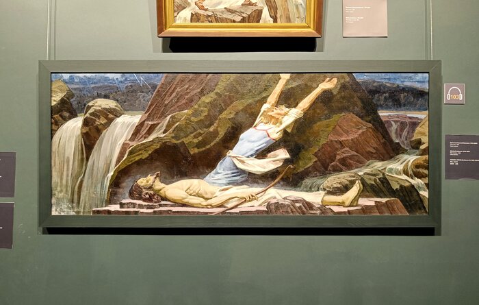 Завершая прогулку по Петрозаводску, рассмотрим несколько крайне любопытных залов местного художественного музея. С 2021 года в Музее изобразительных искусств Республики Карелия открыта постоянная экспозиция «Вселенная Калевала». Её обычно называют выставкой, но я привык, что выставка действует какое-то непродолжительное время, после чего разбирается. Конечно, и эту экспозицию когда-то разберут, но финальный срок не обозначен, поэтому корректнее говорить, что это всё-таки постоянная экспозиция.