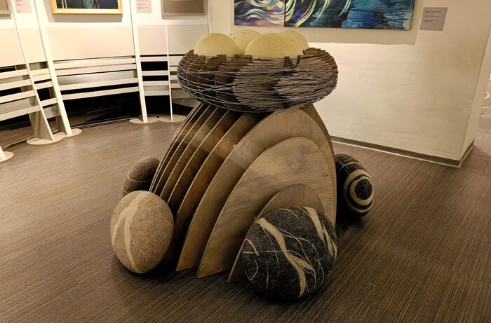 Второй зал «Рождение и трансформация» затрагивает вопросы... ну, рождения и трансформации, очевидно. А эти вопросы всегда рассматриваются в мифологических сюжетах. Должно быть, специально для музея в 2020 году соорудили инсталляцию «Рождение Вселенной „Калевала“», которая намекает на яйца, снесённые уткой на колене Илматар.