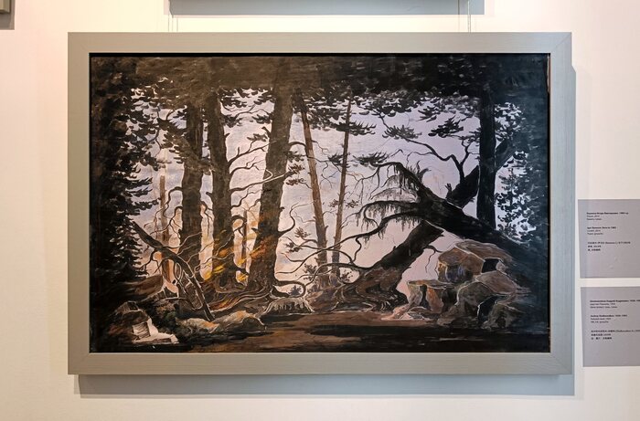 Картина Андрея Шелковникова «Царство Похьёлы» (1959). Шелковников работал как театральный художник в Музыкальном театре (том самом, что на площади) и среди прочего отвечал за сценографию балета «Сампо» композитора Гельмера-Райнера Синисало по мотивам «Калевалы». Перед нами эскиз декорации того балета.