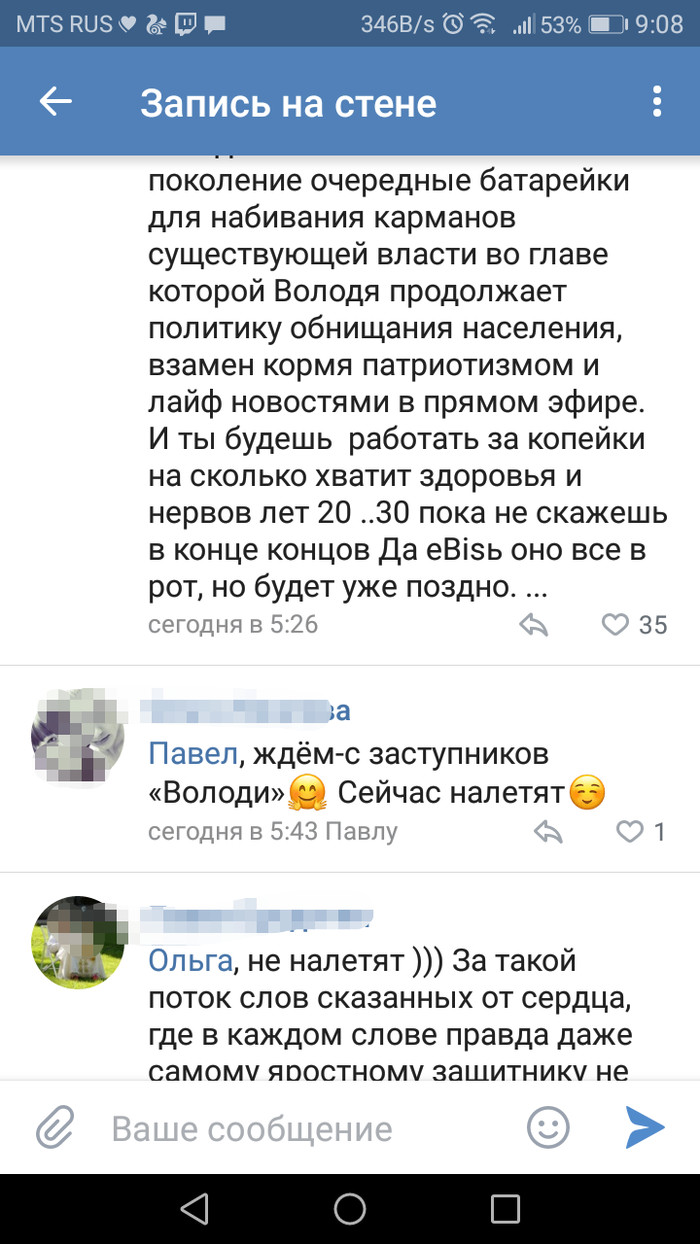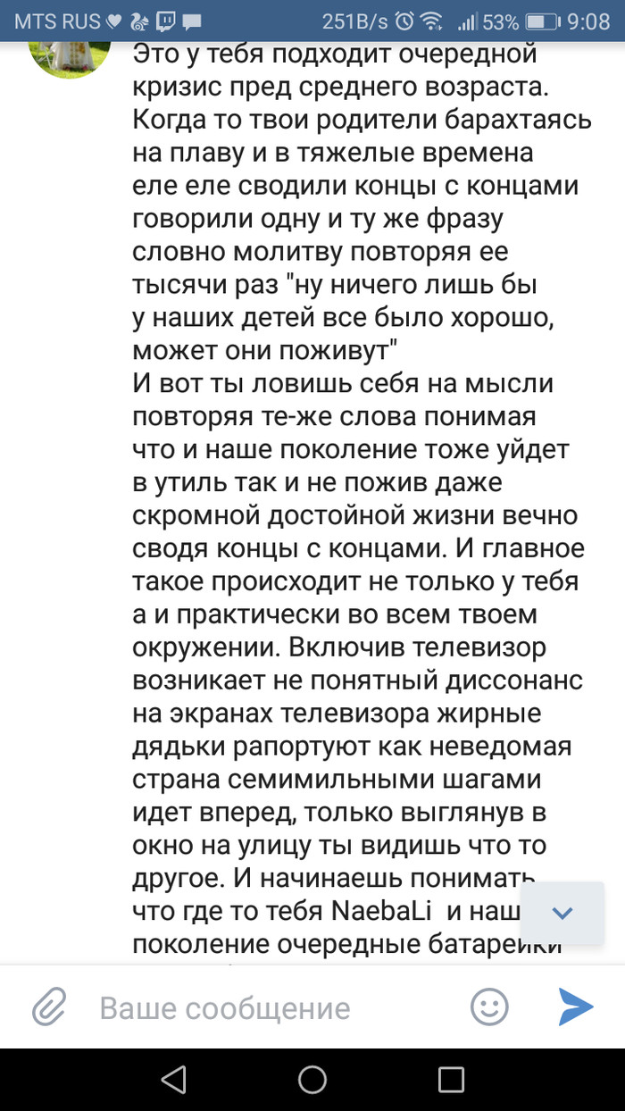 И вот ты ловишь себя на мысли повторяя те-же слова понимая что и наше поколение тоже уйдет в утиль так и не пожив даже скромной достойной жизни вечно сводя концы с концами. И главное такое происходит не только у тебя а и практически во всем твоем окружении. Включив телевизор возникает не понятный диссонанс на экранах телевизора жирные дядьки рапортуют как неведомая страна семимильными шагами идет вперед, только выглянув в окно на улицу ты видишь что то другое. И начинаешь понимать что где то тебя NаebaLi и наше поколение очередные батарейки для набивания карманов существующей власти во главе которой Володя продолжает политику обнищания населения, взамен кормя патриотизмом и лайф новостями в прямом эфире.
