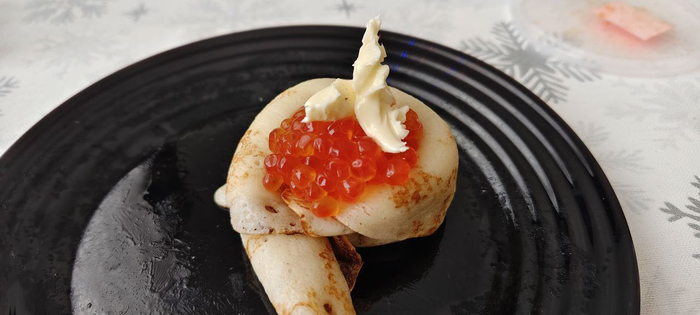 Я люблю смазать блин сметаной, скрутить в трубочку, сверху выложить икру и кусочек масла!