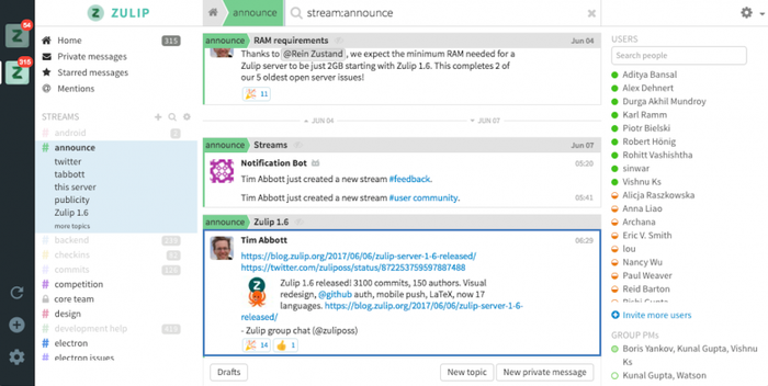Уже успев порядком расстроиться от безысходности, через пару недель я почти случайно наткнулся на Zulip — OpenSource-конкурент слэка (а может и не конкурент, кто их там разберет), очень похожий на то, что мне нужно. Он бесплатен, и установить его на свой сервер может любой желающий, даже если этот желающий — компания из 50 человек.
