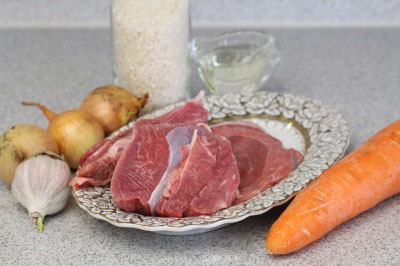 Нарезаем 400 г свинины небольшими кусочками, срезаем излишки жира. Режем 200 г лука, а 150 г моркови трём на тёрке. Рис 250 г хорошо промываем несколько раз в прохладной воде. Вода после промываний должна оставаться прозрачной. Всю лишнюю воду сливаем. Я всегда беру пропаренный рис, он не разваривается и получается рассыпчатым.