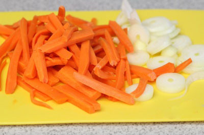 Морковь нарезаем соломкой, лук – кольцами.