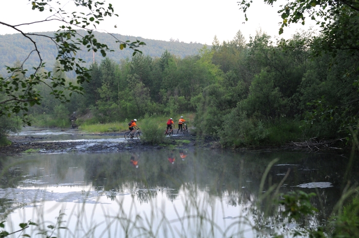 Отъехав буквально несколько сот метров на одной из кочек – отправляюсь в полёт через руль, неприятно, но не смертельно. Хотя только в этом году установленный на руле рог – качественно воткнулся в рёбра. Поднимаюсь и понимаю что одной из двух моих бутылок – нет, пошарил по кустам, но тщетно. Дистанция спланирована так, что с водой вероятнее всего будут затруднения, и поэтому потерять литровую флягу – обидно, но выбора нет, в заброске есть чем пополнить, едем дальше.