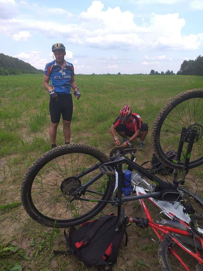 Нахожу какую-то металлическую пластину, камень, отломанный кусок какой-то бороны… Мы не собираемся сдаваться!!! Выколачиваю пин из цепи. Тут подкатывают ребята из нашего класса (они кажется потом победят), у них нет выжимки но есть петух… Фактически отбираем его у них. Такие мелочи как различия в их конструкции меня волновали в тот момент мало. Кручу, верчу, криво, косо, но пытаюсь установить петух и переключатель… Пока переворачиваем так сяк велосипед – ломает планшет для карты… В какой-то момент, когда я понял как я всё это прикорячу, я вижу что направляющая на переключателе согнута, и ролики почти не вращаются. В этих условиях мы точно её не выправим… Сдаваться? Ну нет!!! Вновь берусь за выколотку – будем собирать монопередачу…