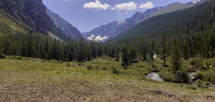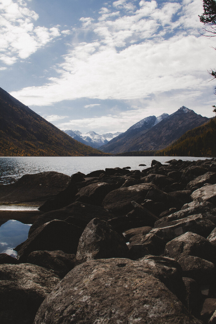 Республика Алтай, Усть-Коксинский район. Среднее Мультинское озеро. В нижней части фото так называемые шумы, переток из Среднего в Нижнее озеро. Отличный вид на озёра с огромного валуна на границе шумов и Среднего озера. Главное успеть, пока он не занят. Лежишь, греешься на солнышке, а вокруг красота!