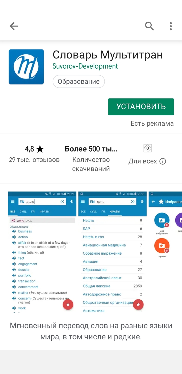 На протяжении пары дней не могла пользоваться этим приложением. По итогу оказалось, что создатель сайта Мультитран Андрей Поминов решил создать своё приложение и попросил разработчика неофициального приложения Илью Суворова свое приложение удалить.