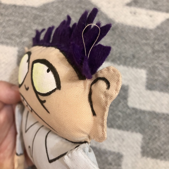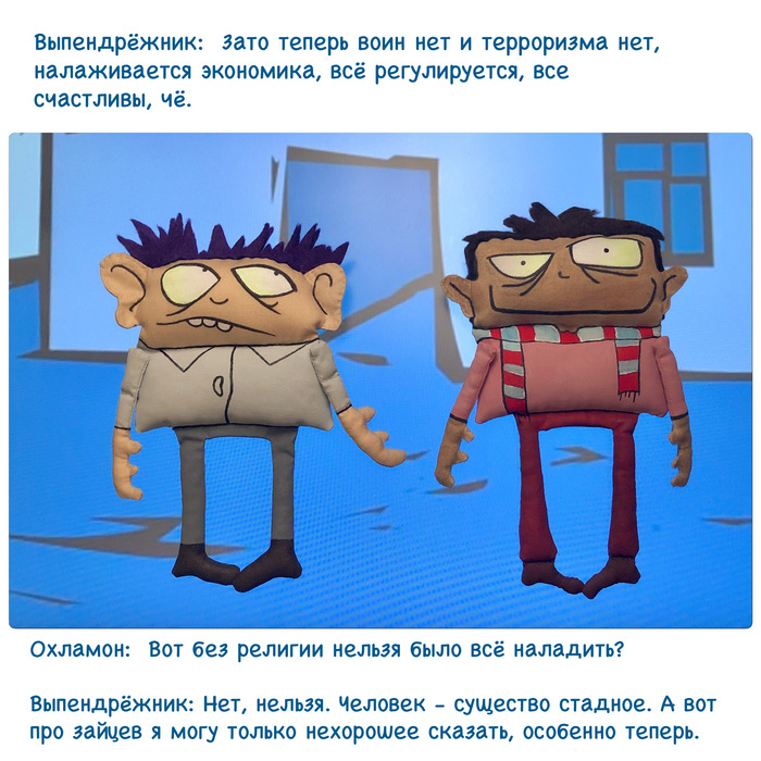 Сделаны из хлопка, начинка - синтепух. Волосы - фетр. Рисунки - акриловые краски для ткани. Рост Чувырлы и Охламона 18 см, Бо 14 см (т.к. уши согнуты, а по выкройке все персонажи одинакового роста)