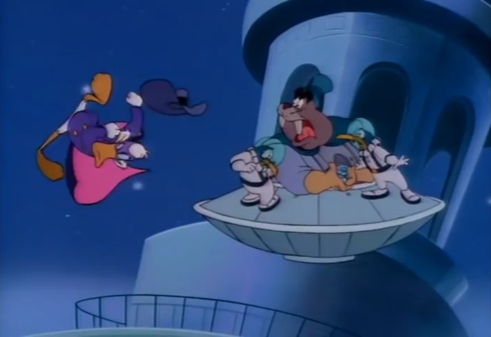 37) ЧП на мотоцикле разбивает забор, прыгает в пикап и водитель с пассажиром улетают в урну. Как и ЧП на фоне блеска молнии, эти кадры в официальных сериях не встречаются. Однако у них есть первоисточник-это сцена погони за байкерами, с которой начинается VHS-версия первой серии "Тайное становится явным". В официальном релизе эту сцену вырезали и начали серию с того, что ЧП уже пойманных байкеров привозит в полицейский участок. Если вам интересно, то вот ссылка на эту удалённую сцену: Darkwing Duck Pilot Intro HQ - YouTube