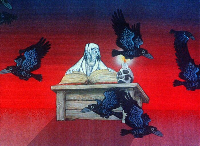 Мультфильм "Крабат - ученик колдуна" (1977). С этим вроде бы всё понятно: мистическая история, с превращениями, мрачными воронами. Ооочень специфично нарисованная, почти мультипликационный арт-хаус.