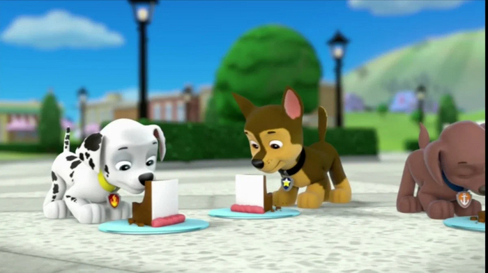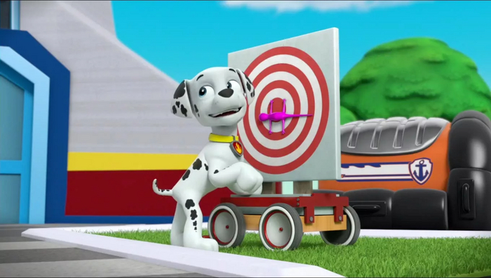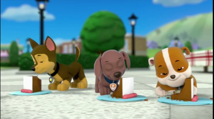 Щенки готовили пироги. Когда они побежали на базу, то глаза Маршалу закрыло частью теста пирога и он наступил лапой в другой пирог и сбил щенков, а пирог оказался на хвосте Маршала и начал крутиться так как Маршал начал вилять хвостом и Маршал так пошутил