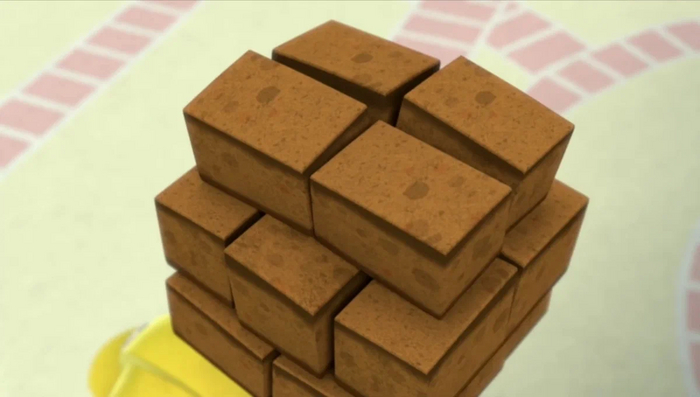 Щенки играют в игру которая в нашем мире имеет название "Дженга" У них строится башня из косточек после чего каждый из щенков вытаскивает косточку и у кого башня упала тот и проиграл. Когда их вызвали Маршал наступает на косточки и сбивает щенков в итоге все они падают в виде пирамиды и Маршал хочет помочь, но в итоге опять все падают и он так шутит.