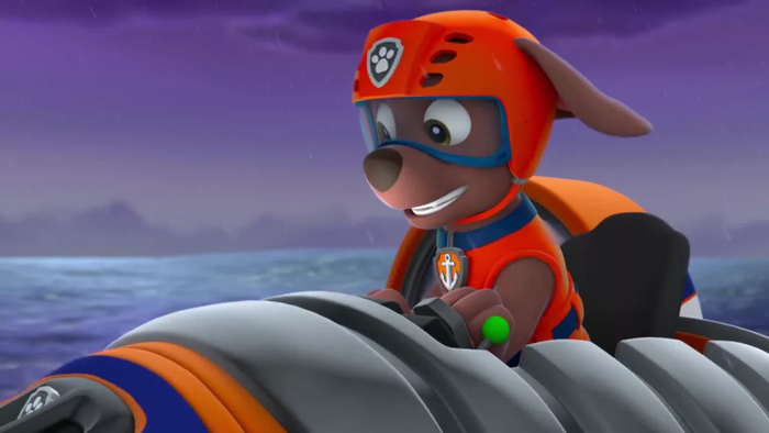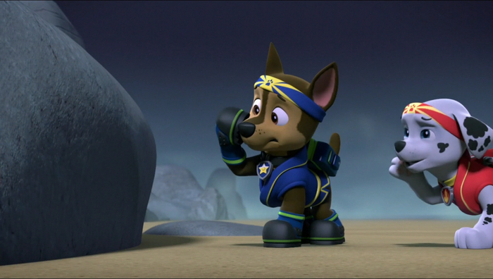 Щенки бегут на пляжную базу и Маршал наступает на доски для сёрфинга и катиться на них после чего сбивает щенков и шутит.