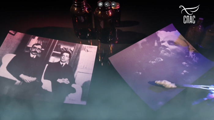 Далее идут кадры из документального фильма 1999 года под названием Мавзолей, и нам показывают как происходит обслуживание тела Ленина, а Афанасьев рассказывает как происходило бальзамирование. Все это известно со слов сына Збарского — академика РАМН Ильи Збарского, который так же, как отец, ухаживал за телом Ленина в мавзолее.