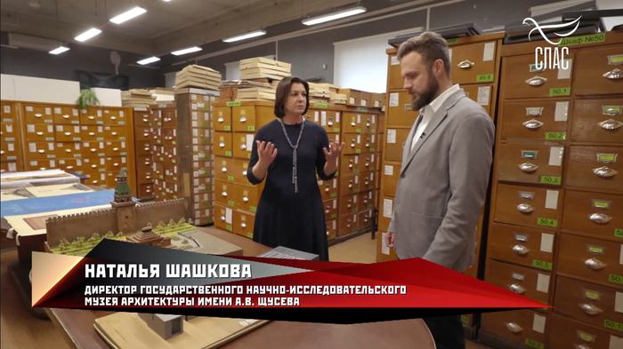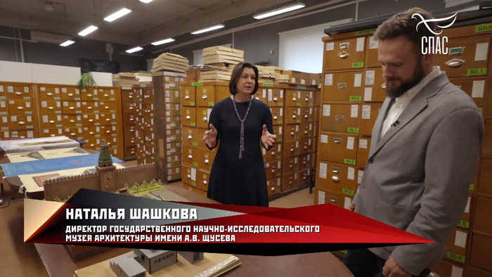 После этого, Афанасьев отправляется в музей Щусева, где задает директору музея разные вопросы. Афанасьев спрашивает, что хотел сказать автор. Наталья Шашкова, вполне обоснованно говорит, что автор хотел организовать пространство для прощания с вождем, так как главная задача что стояла перед Щусевым, так это направить потоки народных масс, для этого люди входят в один павильон, по лесенке спускаются в пространство под землей, обходят траурный зал и выходят из другого павильона.