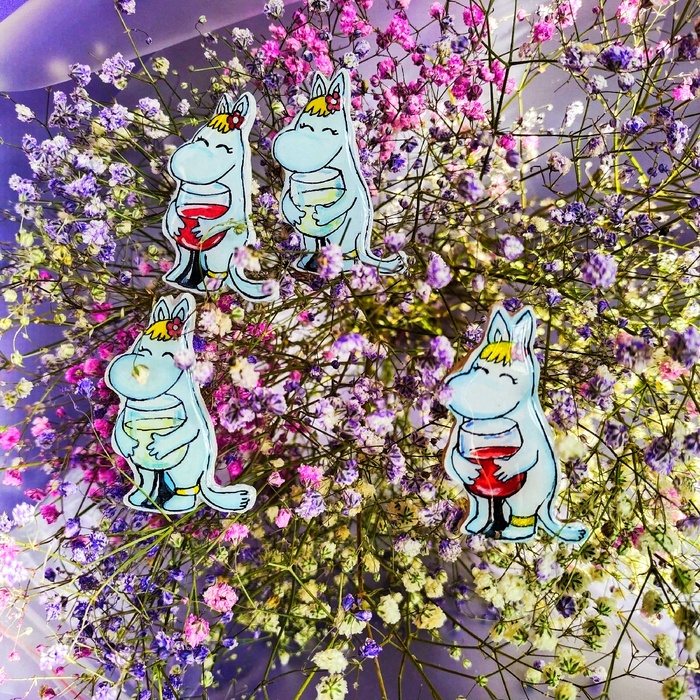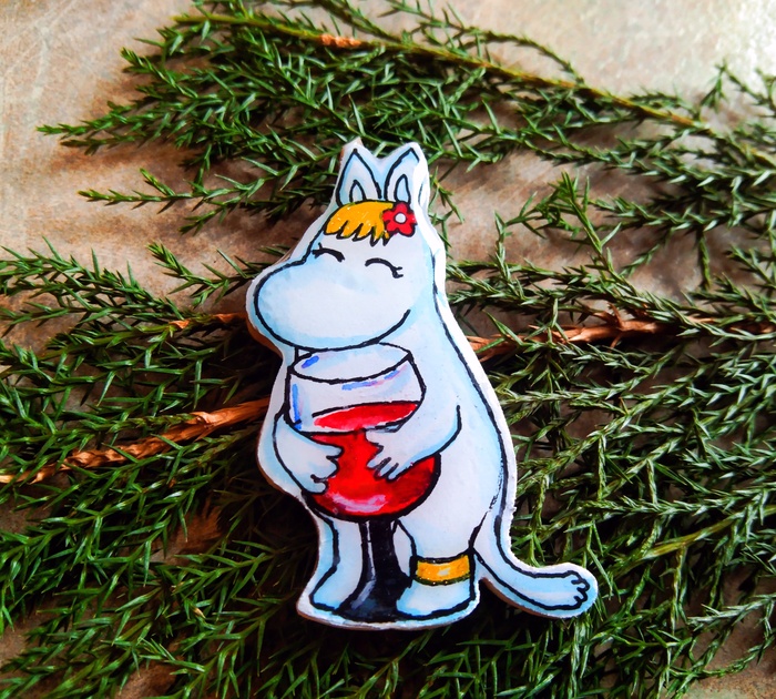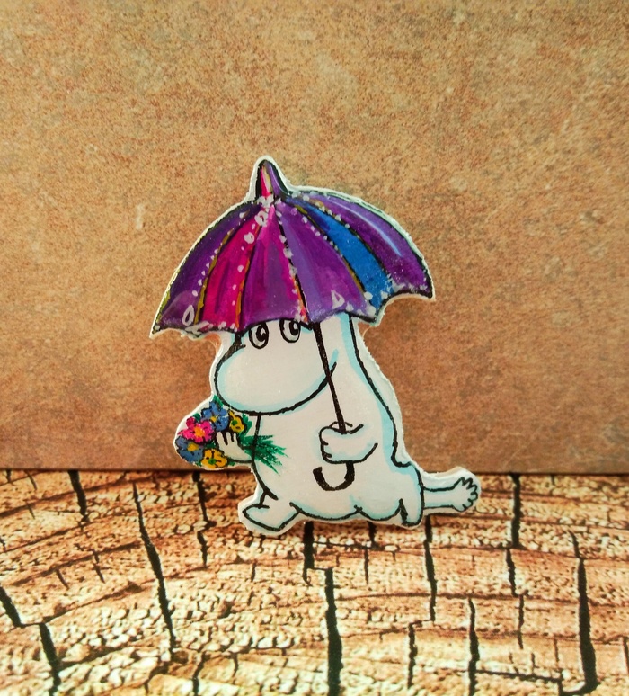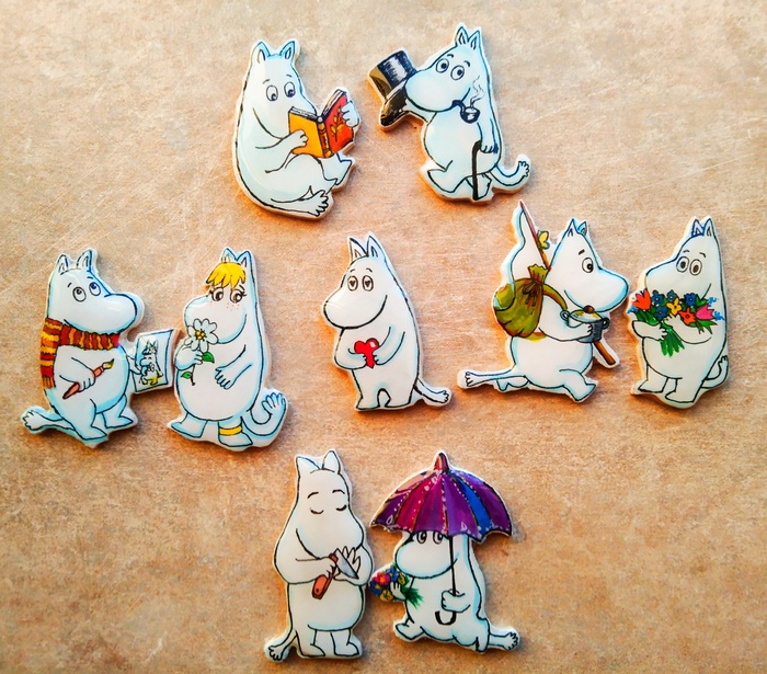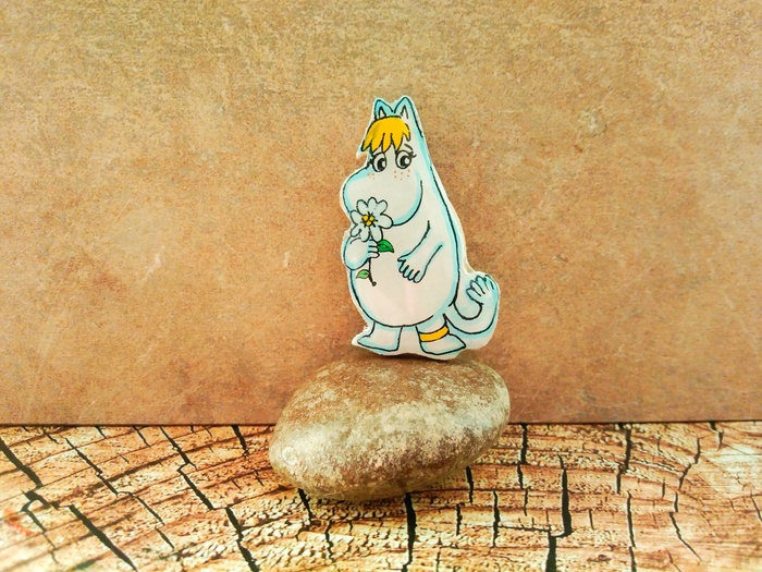 Муми на деревянной основе. Расписаны вручную акриловыми красками. Покрыты линзой из смолы.