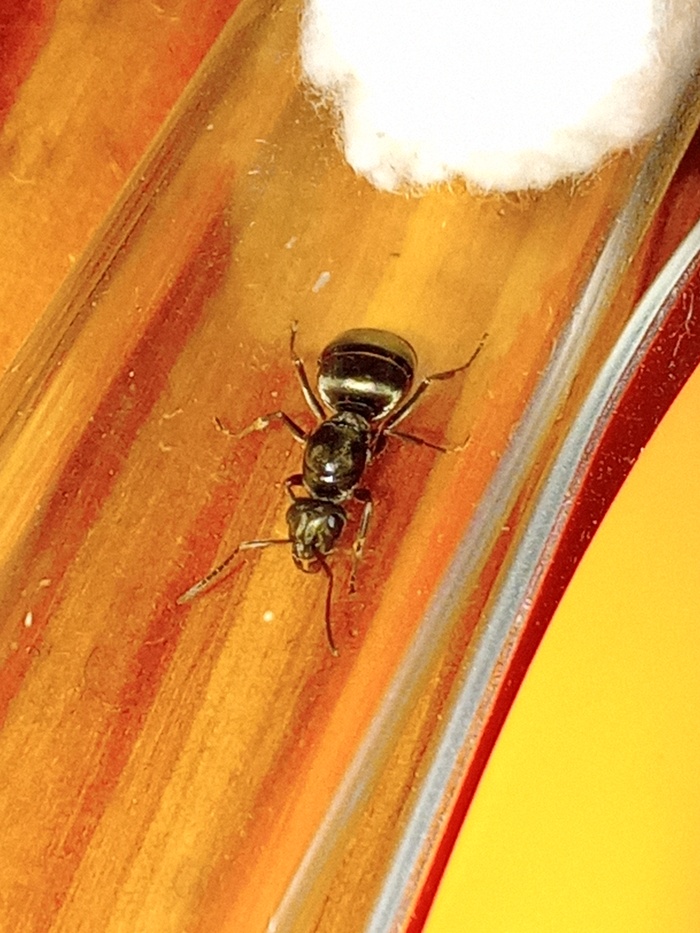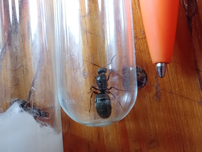Помогите, пожалуйста, определить вид. Доступа к antmap просто сейчас нет. Матка в пробирке с мокрой ватой принадлежит к виду lasius niger, она представлена для сравнения. Матка в пробирке рядом с ручкой была поймана сегодня, 15 августа, в Лен области, примерно в 16:30. Она покрупнее и пошустрее матки лазиусов. Окрас черный, отливает сероватым. Есть подозрение на Formica cunicularia (из-за графика их лёта), но, как я уже говорил, у меня нет доступа к antmap, не могу посмотреть обитает ли этот вид у меня. Вообще-то я понимаю, что фотографии не очень хорошего качества, и Вам будет тяжело определить вид. Но, возможно, Вы сможете мне сказать, надо ли этой матке давать рабочих и коконы? Она в одиночку сможет колонию поднять? И если нет, то какие виды можно к ней подсаживать?