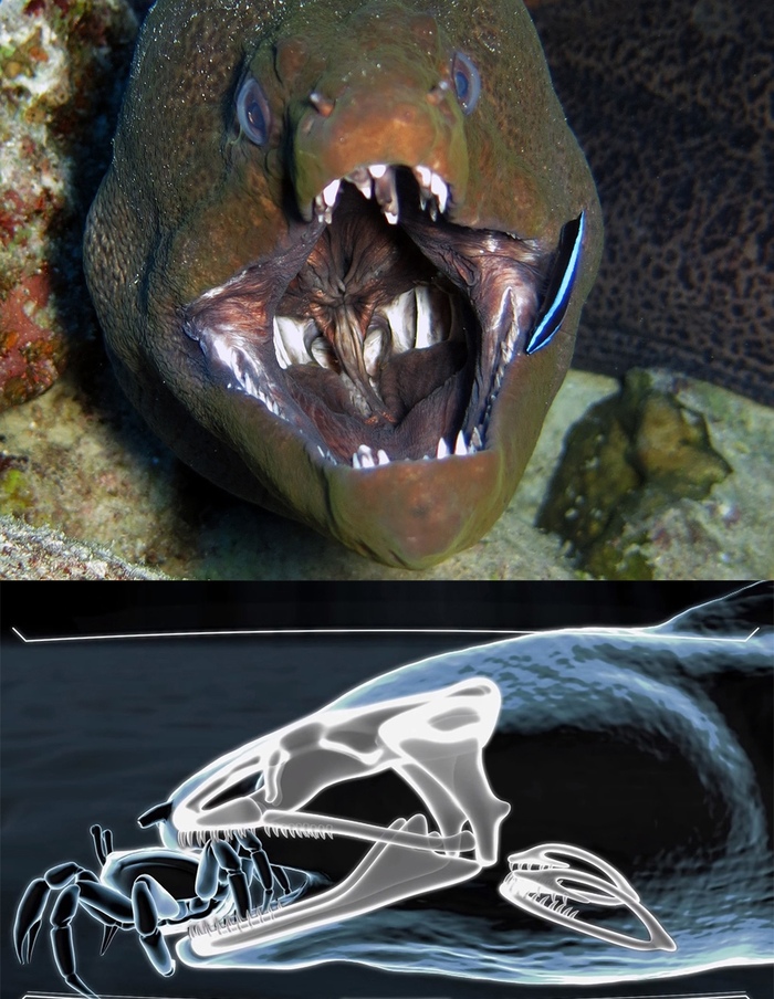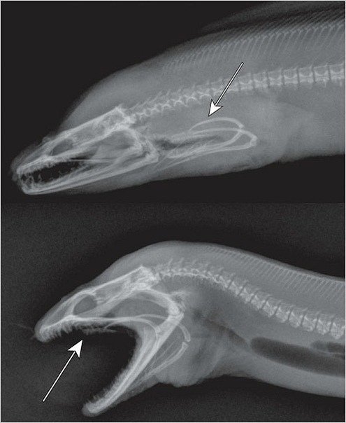 Познакомившись с челюстями нашей героини, мы подошли к главной её особенности, с которой начинали. У мурены есть ещё глоточные челюсти, которые прячутся внутри пасти. При захвате добычи обычными челюстями глоточная пара выдвигается специальными мышцами вперед (совсем как у Чужого) и дополнительно удерживает жертву теперь уже совсем намертво (см картинки и рентгеновский снимок под постом). Потом глоточная пара затаскивает добычу в пищевод, а основные челюсти хватают дальше, чтобы отгрызть кусок побольше.