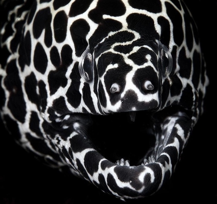 Вид у неё серьезный, но взгляд при этом странный, как будто удивлённый. Скорее всего, это из-за того, что мурены попросту плохо видят: различают движение, замечают разницу между светом и тенью, но ориентируются большей частью с помощью обоняния и вкусовых рецепторов, находящихся на всей поверхности тела.