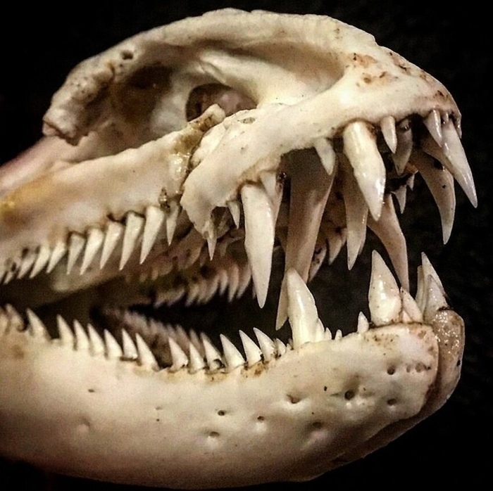 Привычное занятие мурены - сидеть в засаде с полуоткрытой пастью. Так как у неё нет жаберных крышек, ей приходится пропускать воду через пасть. Совсем как красная шапочка, от глазок и ушек переходим к зубкам, которых у мурены - полная пасть! Если посмотрите на фото снизу, увидите череп мурены и челюсти, полные здоровенных острых конических зубов.